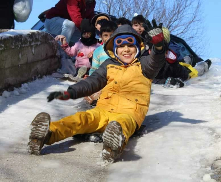 Bursa’da yoğun kar yağışı ve aşırı buzlanma sebebiyle okulların tatil edilmesini fırsat bilen çocuklar, poşet ve kızaklarını alıp birbirleriyle yarıştı.