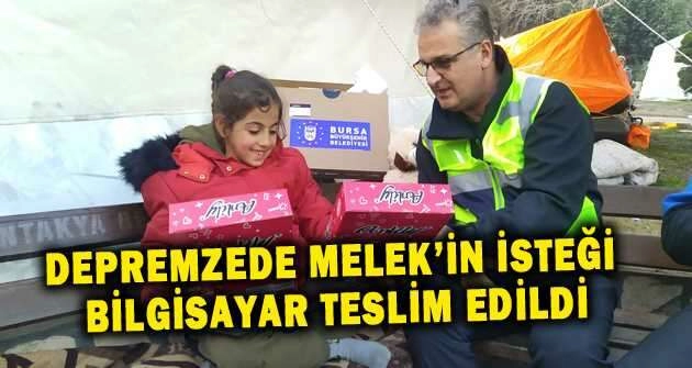 Hatay’da deprem mağduru vatandaşların yaralarını sarmak için mahalle mahalle gezerek yardımlarını ulaştıran Bursa Büyükşehir Belediyesi ekipleri, depremzede miniklerin yüzünü güldürmeye devam ediyor. Evlerinin yıkılması sonucu çadırda kalan 7 yaşındaki Melek’in bilgisayar isteğine duyarsız kalamayan Büyükşehir Belediyesi ekipleri, minik kızı ziyaret edip istediği bilgisayarı teslim ederek yüzünü güldürdü.