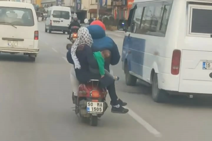 Bursa’da bir aile, motosiklete çocuklarıyla beraber binerek ilerledi. Tehlikeli yolculuk kameraya yansıdı.