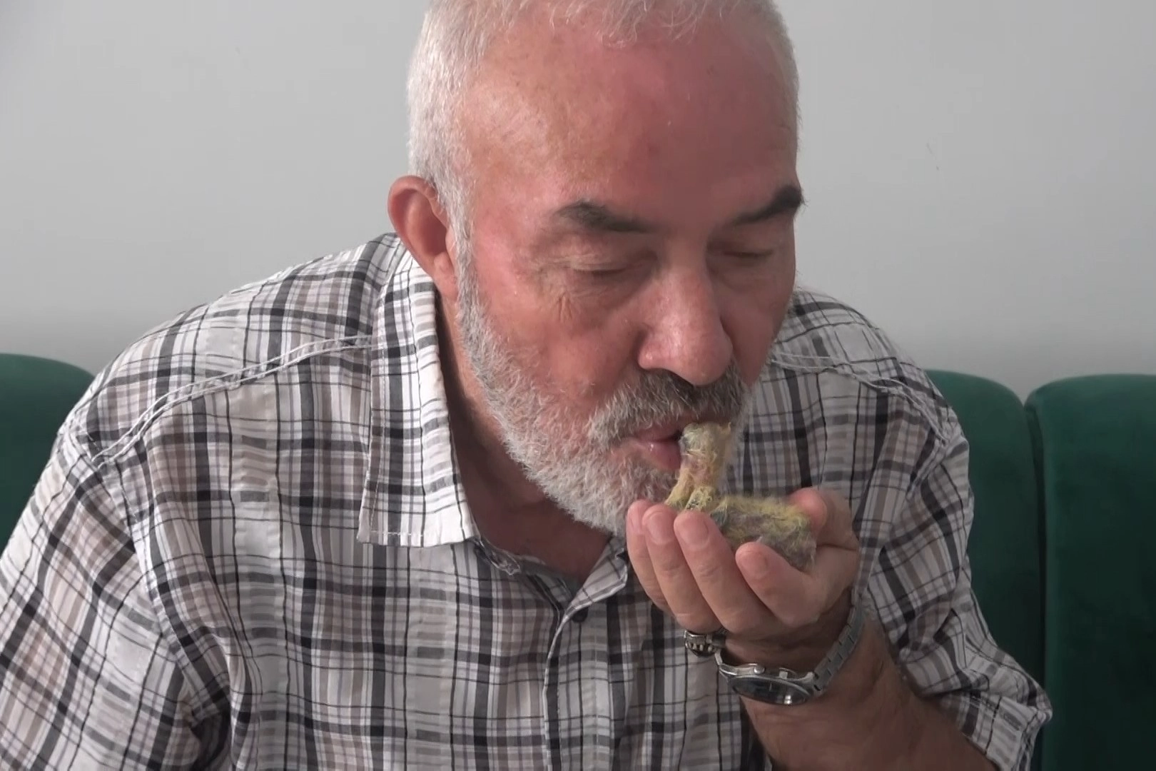 Yozgat'tan Bursa'daki oğlu ve gelinin evine misafir olarak gelen 62 yaşındaki Yusuf Ovalı, evin arkasında bulduğu ölmek üzere olan yavru güvercini eve aldı. Ağzında ekmek çiğneyerek besleyen baygın haldeki kuşu su da içirerek canlandırdı. Misafirliği süresince pamuklara sararak beslediği kuşu her gün ağzıyla besleyen Ovalı, yavru kuşun kendisini annesi sandığını ve sesini duyunca ötmeye başladığını söyledi.