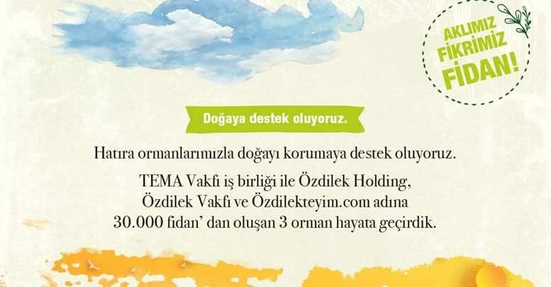 Özdilek, gelecek nesillere bırakılacak en güzel mirasın doğa olduğu şuuruyla Özdilek Holding, Özdilek Vakfı ve Özdilekteyim.com adına oluşturduğu 3 hatıra ormanında, toplam 30 bin fidanın toprakla buluşmasını sağladı. Yıllar içerisinde eşsiz bir ormana dönüşecek olan 30 bin fidan, saatte 51 ton oksijen üretip, 69 ton karbondioksiti bünyesine alarak, doğaya büyük bir katkı sağlamış olacak. Kurumsal sosyal sorumluluk projelerine azami ölçüde önem veren Özdilek, çevreye zarar vermeden üretim yapan fabrikalarıyla hizmet veriyor. Holding, ekolojik dengeyi bozmadan sağladığı besi üretimi, doğal kaynakları verimli bir şekilde kullanarak oluşturduğu enerji üretimi ve çalışanlarına yönelik gerçekleştirdiği eğitimler ile de sürdürülebilir çevre projelerine yenilerini eklemeye devam ediyor.
