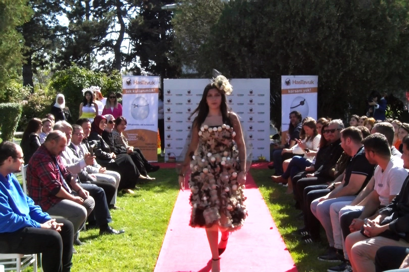 Yumurta kabukları, yem çuvalları, tavuk tüyleri, yumurta violleri gibi atık malzemelerle kendi hayal gücünü kullanarak elbise tasarlayan öğrenciler çevre kirliliğine ve su krizine dikkat çekti. Birbirinden farklı kıyafetlerle podyuma çıkan öğrenciler izleyicilerden tam not aldı.
