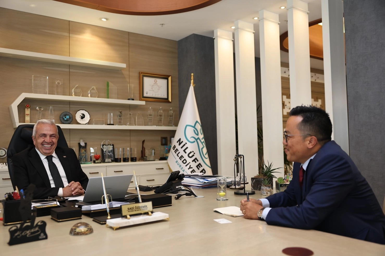 Hindistan İstanbul Başkonsolosu Shri Mijito Vinito, Nilüfer Belediye Başkanı Şadi Özdemir’i Nilüfer Belediyesi Halk Evi’nde ziyaret etti. 31 Mart 2024’te gerçekleştirilen Mahalli İdareler Seçimi’nde Nilüfer Belediye Başkanı seçilen Şadi Özdemir’i tebrik eden Vinito, ikili ilişkilerin güzel bir seviyede olduğunu belirterek, yeni dönemde de Özdemir’in liderliğinde bu durumun sürdürüleceğine inandığını söyledi. Nilüfer Belediyesi ile daha önceki yıllarda 21 Haziran ‘Dünya Yoga Günü’’nde etkinlikler düzenlediklerini hatırlatan Vinito, bu yıl da Dünya Yoga Günü etkinliğini yine birlikte düzenlemek istediklerini belirtti. Başkonsolos 21 Haziran’ın bu yıl Kurban Bayramı tatilinin hemen sonrasına denk gelmesi nedeniyle tarihi biraz daha öne çekmek istediklerini de dile getirdi. Ziyaret için teşekkür eden Nilüfer Belediye Başkanı Şadi Özdemir ise kültürlerin etkileşimini önemsediklerini belirterek, gerçekleştirilmesi planlanan etkinlikle ilgili destek verebileceklerini aktardı. Başkan Özdemir, görüşmede, seçim vaatleri arasında yer alan ‘Dijital Köy Projesi’nden de bahsetti. Özdemir, “Nilüfer’in geleneksel iş modellerini, yerleşik hayatı reddederek zamandan ve mekandan bağımsız hareket eden dijital göçebeler için cazip bir destinasyon olmasına yönelik projeler ve mekanlar tasarlayacağız. Projeyle, gençlerimize hem köyde doğal ve temiz bir ortamda çalışma fırsatı oluşturacağız, hem de köy yaşamını zenginleştirerek, dijitalleşmeyle köyün tanıtımını ve dünyaya açılımını sağlayacağız. Hindistan’ın yazılım konusunda gelişmiş seviyede olduğunu biliyoruz. Yazılımla ilgili desteklerinizden büyük mutluluk duyarız. Hindistan ve Nilüfer Belediyesi olarak birlikte proje yapmak isteriz” dedi. Nilüfer’in kendileri için değerli olduğunu söyleyen Hindistan İstanbul Başkonsolosu Shri Mijito Vinito da ‘Dijital Köy Projesi’ ile ilgili ellerinden gelen desteği vermeye hazır olduklarını ifade etti.
