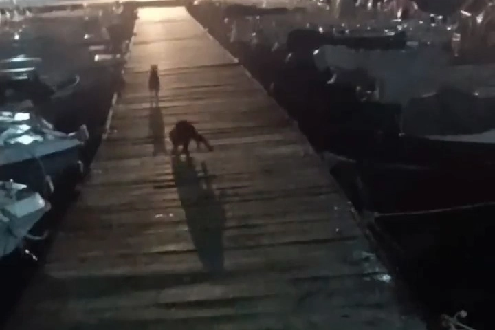 İskelede gördüğü kediyi kovalayan su samuru, renkli görüntüler oluşturdu.