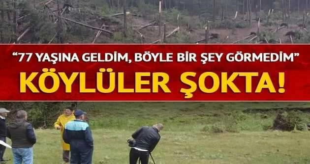 Mehmet Kara da devrilen ve gövdesinden kırılan ağaçları inceledi. Büyük afet yaşadıklarını anlatan Kara, "Dün büyük bir rüzgarla karşılaştık. Sesini duyduk, sonradan buraya geldik. Buralarda büyük bir afet olmuş. 66 yaşındayım, böyle bir şey görmedim. Allah korusun köyümüze gelse, ortadan kaldırabilirdi" ifadelerini kullandı.