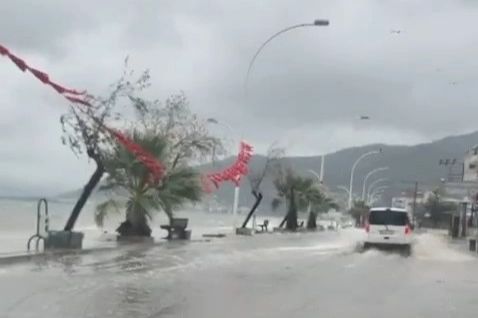Araçlar yollarda ilerlemekte güçlük çekerken, fırtınanın etkisi vatandaşların kameralarına yansıdı. Deniz ile karayolu birleşirken, binlerce dönüm ekili tarım alanı da sular altında kaldı.