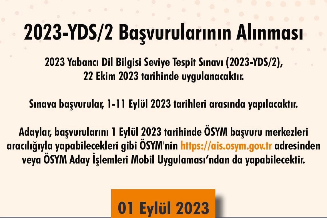 Ölçme, Seçme ve Yerleştirme Merkezi Başkanlığı (ÖSYM) tarafından yapılan açıklamada, 2023-YDS/2 başvurularının alınmaya başlandığı duyuruldu. Başvurular, 1-11 Eylül tarihleri arasında yapılabilecekken, 2023-YDS/2 22 Ekim tarihinde gerçekleştirilecek. Adaylar, başvurularını ÖSYM'nin https://ais.osym.gov.tr adresinden yapabilecek.