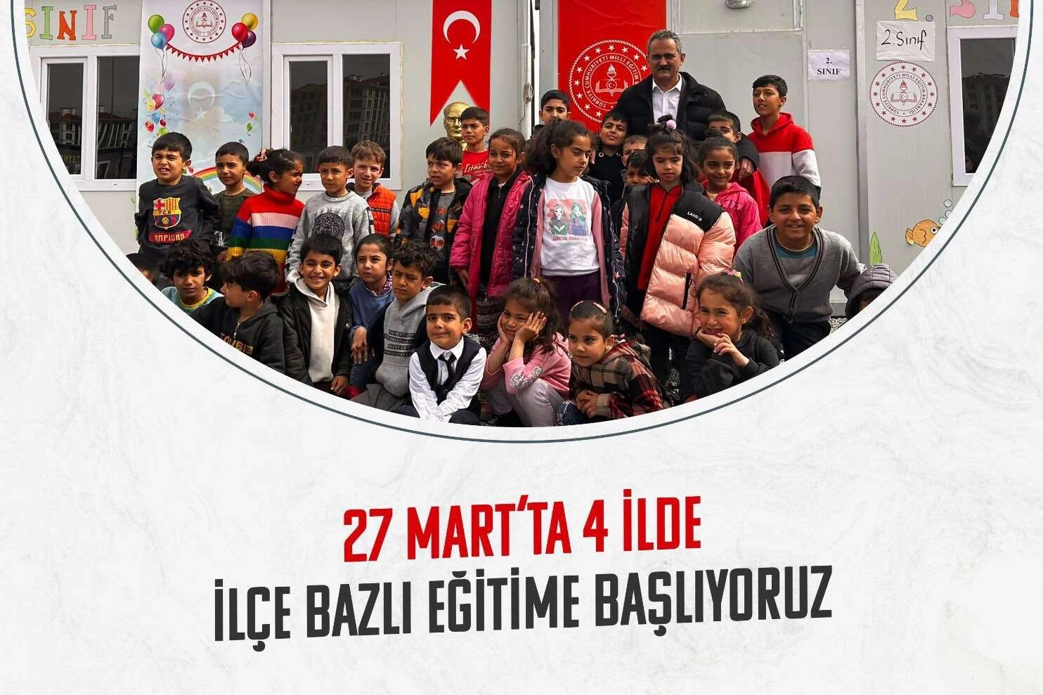 Milli Eğitim Bakanı Mahmut Özer, "27 Mart Pazartesi günü afet bölgesindeki 4 ilimizde kademeli olarak eğitime başlıyoruz” dedi. Milli Eğitim Bakanı Mahmut Özer sosyal medya hesabından yaptığı paylaşımda, "27 Mart Pazartesi günü afet bölgesindeki 4 ilimizde kademeli olarak eğitime başlıyoruz. Evlatlarımızı okullarında öğretmenleri ve akranlarıyla buluşturmaya devam ediyoruz” ifadelerini kullandı. 4 ilde eğitime başlanacak ilçelerin listesi ise şu şekilde: "Malatya: Arapgir, Arguvan, Kale, Pütürge, Doğanyol, Yazıhan, Darende ve Hekimhan Adıyaman: Kahta, Gerger, Sincik, Samsat ve Çelikhan Kahramanmaraş: Andıran ve Ekinözü Hatay: Yayladağı, Altınözü, Erzin, Reyhanlı, Payas, Dörtyol ve Arsuz."