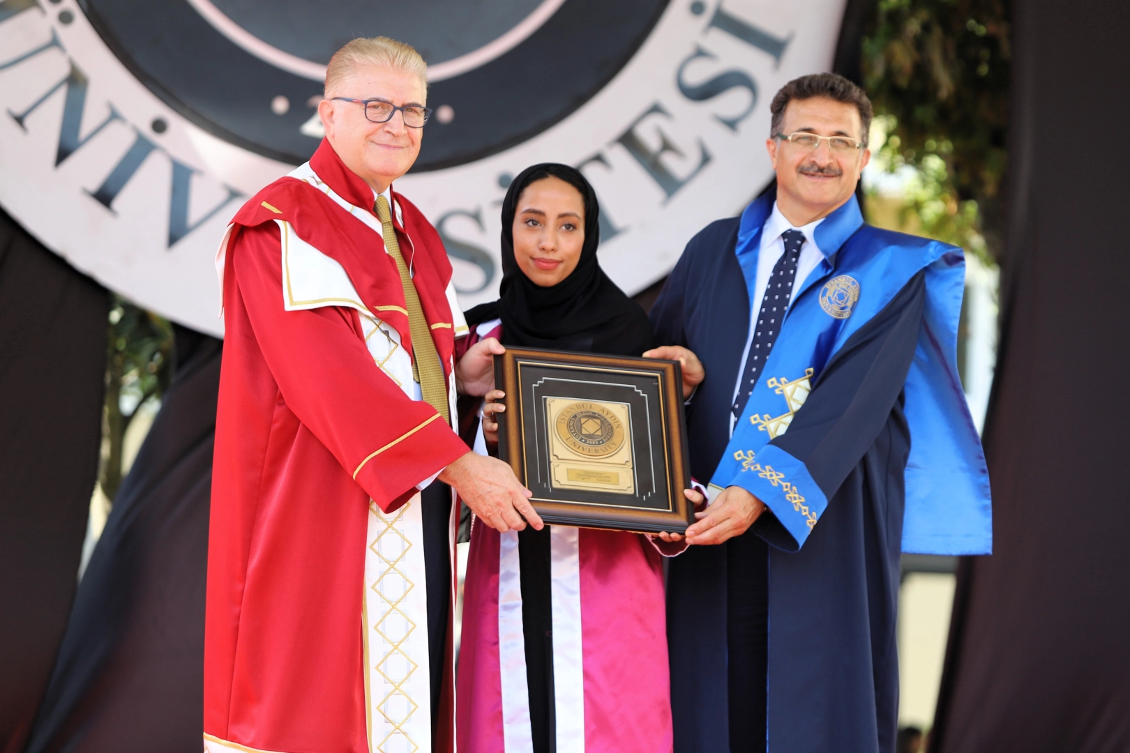 Mezuniyet töreninde konuşma yapan Abdulmajid, “Buradaki tüm anne ve babalar benim ailem oldu” dedi. Üniversiteyi ülkesinde yaşanan siyasi sıkıntılar dolayısıyla Türkiye’de okumaya karar veren İktisadi ve İdari Bilimler Fakültesi Havacılık Yönetimi İngilizce Bölümü öğrencisi Yemenli öğrenci Alhanoof Abdulmajid, İstanbul Aydın Üniversitesinin 18. dönem birincisi oldu. Mezuniyet belgesi ve ödülünü başarısının herkese örnek olması gerektiğini söyleyen Mütevelli Heyet Başkanı Doç. Dr. Mustafa Aydın’ın elinden alan Abdulmajid, “Buradaki tüm anne ve babalar benim ailem oldu” dedi. Abdulmajid, sürekli gelişen ve büyüyen bir üniversitenin mensubu olmanın getirdiği sorumlulukla, kendilerini geliştirmenin yollarını arayarak, iyi bir öğrencilik geçirdiğini söyleyen Abdulmajid, konuşmasında üniversite akademik kadrosuna teşekkür etti. Abdulmajid, “Başta Rektör Prof. Dr. Yadigâr İzmirli olmak üzere, bilgi birikimleriyle bizlere yol gösteren, araştırmayı, sorgulamayı öğreten hocalarımıza, bizlerden hiçbir desteği ve yardımı esirgemeyen üniversite personeline ve son olarak, hayatını bize vakfetmiş çok değerli Mütevelli Heyet Başkanımız Sayın Doç. Dr. Mustafa Aydın’a, sonsuz teşekkürlerimizi sunuyorum” dedi. “Hayal gücümüzü kullanmaktan korkmayalım” Kalabalık bir ailenin parçası olmaktan onur duyduğunu ifade eden Abdulmajid, “Bugün burada yalnız bulunmuyorum. En az benim kadar çalışmış, çabalamış ve kitap sayfaları arasında kendilerini kaybetmiş tüm arkadaşlarım adına buradayım. Hepimiz için zorlu geçen bu süreç birbirimizin varlığıyla keyiflendi. Aynı disiplin ve sorumluluk bilinciyle hayatımıza devam edeceğimizi biliyorum. Bu yorucu süreci benim için keyifli kılan bir diğer unsur ise ailem. Hep yanımda olduğunuz ve bir an olsun desteğinizi eksik etmediğiniz için size çok teşekkür ediyorum. Bu başarı sizin. İyi ki varsınız” dedi. Abdulmajid, konuşmasına şöyle devam etti: “‘Hayal gücü bilgiden daha önemlidir. Çünkü bilgi sınırlıyken, hayal gücü tüm dünyayı kapsar.’ der Einstein. Çünkü değişimi getirecek asıl etkenin hayal gücü olduğunu biliyordur. 16. Yüzyılda Ay’a çıkmayı hayal etmeye başlayan insanoğlu bunu edebiyata aktarmış, yüzyıllar boyunca hakkında kitaplar ve hikayeler yazmıştır. 20. Yüzyılda bilim insanları bilginin sınırını anlamış, var olan sorunlara çözümler üretmek adına çocukların hayal gücünden yararlanmış ve sonunda Ay’a çıkmayı başarmıştır. Bizler de bugün hayal ederek başlayalım hayatımızın geri kalanına. Hayal gücümüzle harmanladığımız bilgi birikimimizi daha iyi bir gelecek inşa etmek uğruna kullanmaktan korkmayalım. Korkmayalım ki, imkansız gibi görünen her şey mümkün olsun. Korkmayalım ki, yarınlarımız dünden daha güzel olsun.” İAÜ Mütevelli Heyet Başkanı Doç. Dr. Mustafa Aydın da Abdulmajid’in ödülünü bizzat takdim ederken, kendisine ailesinin burada olup olmadığını sordu. Üniversite birincisi Yemenli Abdulmajid ise “Bu tribünlerde oturan bütün anneler babalar benim ailemdir” dedi.