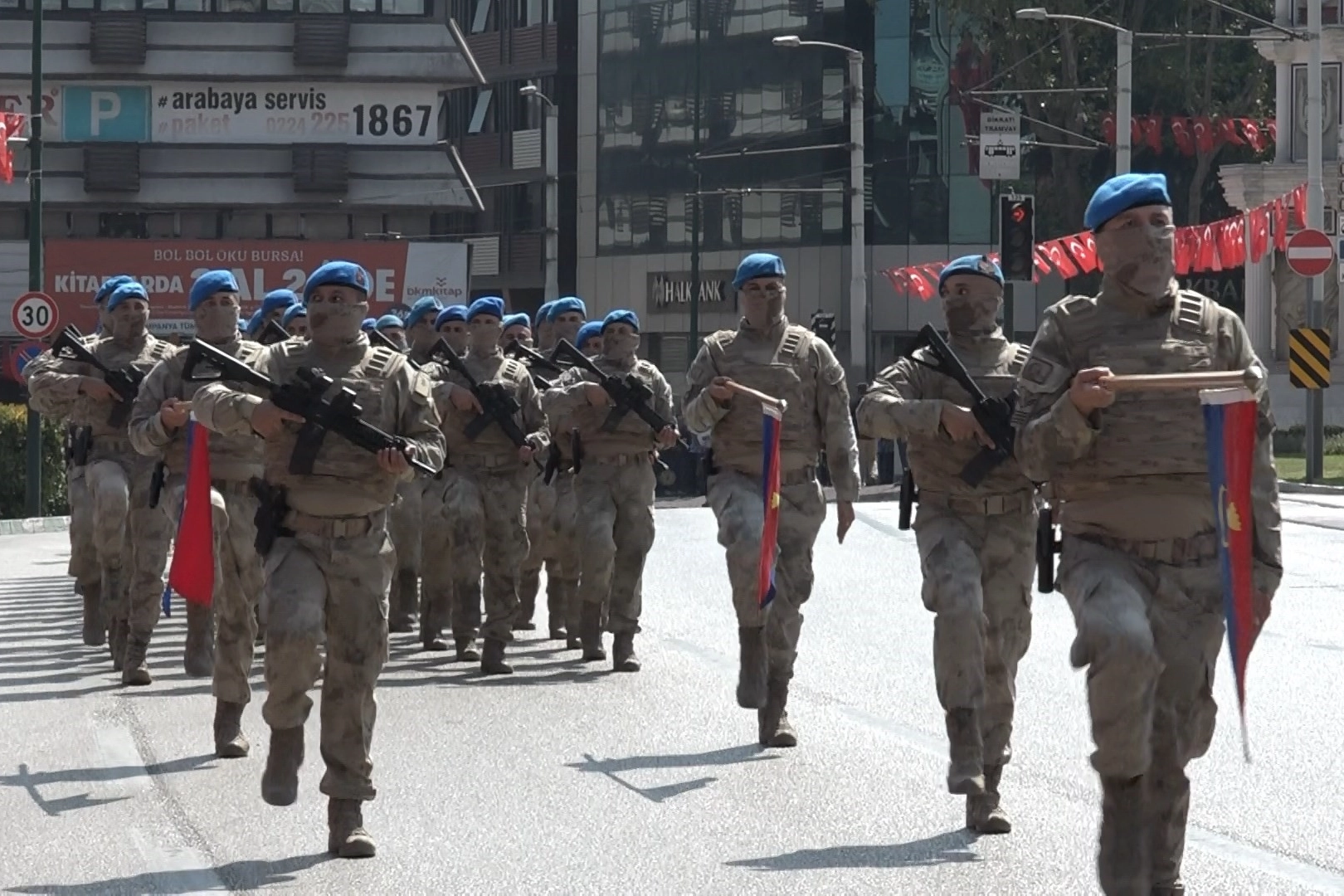 Ardından üstü açık araçla vatandaşların bayramını kutladı. Selamlama sonrası Osmangazi, Yıldırım, Nilüfer belediyeleri folklor ekipleri gösterilerini sundu. Program, günün anlam ve önemini anlatan konuşma ve şiirin ardından resmi geçitle devam etti.