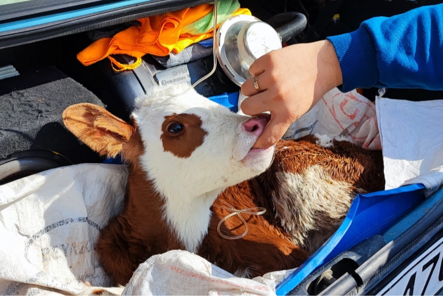 Sivas’ta yaşayan Ömer Çiftçi, üşütüp hastalanan 4 günlük buzağısını otomobilinin bagajında veterinere götürdü. Veterinerde tedavisi yapılan buzağıya bagajda serum takıldı, aynı zamanda güneşte kalması sağlandı. Bagajda hem güneşlenen hem de sahibinin parmağını emen buzağı yüzleri gülümsetti. Bir süre bagajda güneşlenen baygın haldeki buzağı, serumun bitmesini ardından kendine gelerek ayaklandı.