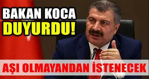 Sağlık Bakanı Fahrettin Koca, ikna edilerek aşı tereddünün kaldırılmasının daha doğru olduğunu düşündüğü belirtti. BAKAN KOCA: PCR TESTİ İSTEYEBİLİRİZBakan Koca, aşı olanın yanında aynı uçak, otobüs, sinema veya tiyatroda oturacak kişinin virüsü taşıyıp taşımadığını anlamak için PCR testi istenebileceğini belirtti.