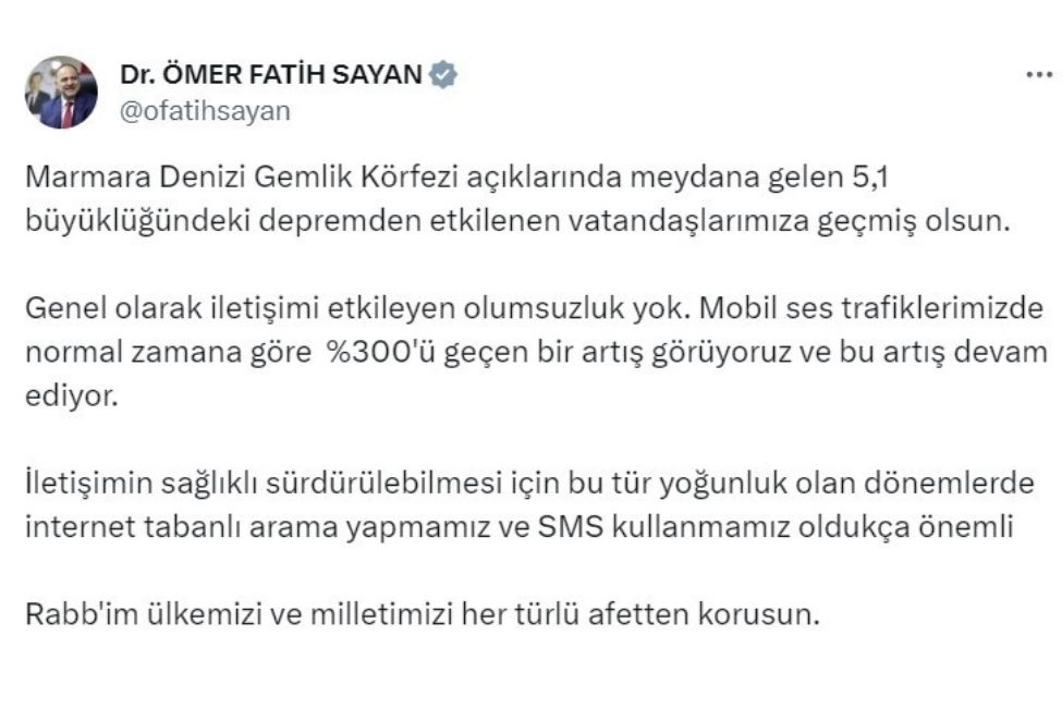 Ulaştırma ve Altyapı Bakan Yardımcısı Ömer Fatih Sayan, Marmara Denizi Gemlik Körfezi’nde meydana gelen 5,1 büyüklüğündeki deprem sonrası sosyal medya hesabından açıklamalarda bulundu. Sayan, SMS kullanmanın önemine dikkati çekerek, “Genel olarak iletişimi etkileyen olumsuzluk yok. Mobil ses trafiklerimizde normal zamana göre yüzde 300'ü geçen bir artış görüyoruz ve bu artış devam ediyor. İletişimin sağlıklı sürdürülebilmesi için bu tür yoğunluk olan dönemlerde internet tabanlı arama yapmamız ve SMS kullanmamız oldukça önemli” ifadelerine yer verdi.