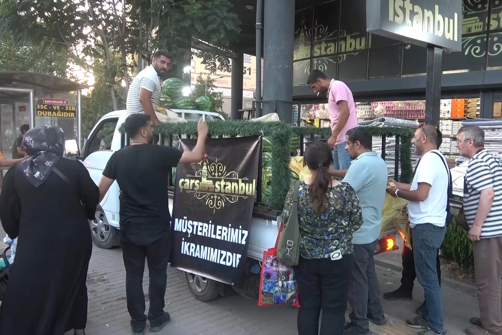Bursa'da bir zücaciye mağazası, sıcak yaz günlerinde bunalan vatandaşlara serinlemeleri için ücretsiz karpuz dağıttı. Mağazaların önünde 4 kamyon, yaklaşık 20 tonu bulan karpuzlar 25 dakika içinde tükendi. Mağaza sahibi Bekir Yetişen, "Yıllardır bizimle alışveriş yapan müşterilerimizin bu sıcak yaz günü akşamında serinlemelerini istedik" dedi.