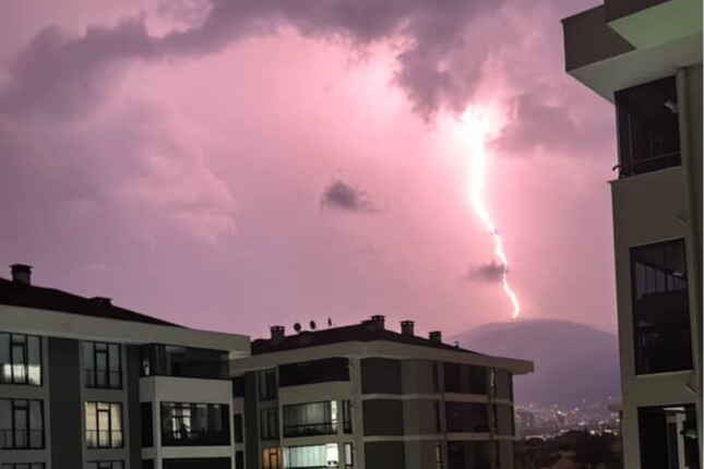 Bursa’da akşam saatlerinde atıştıran yağmur damlaları gecenin karanlığı ile birlikte yerini gök gürültüsüne bıraktı. Gökyüzünden neredeyse yere kadar uzanan şimşek gecenin karanlığını aydınlığa çevirdi.