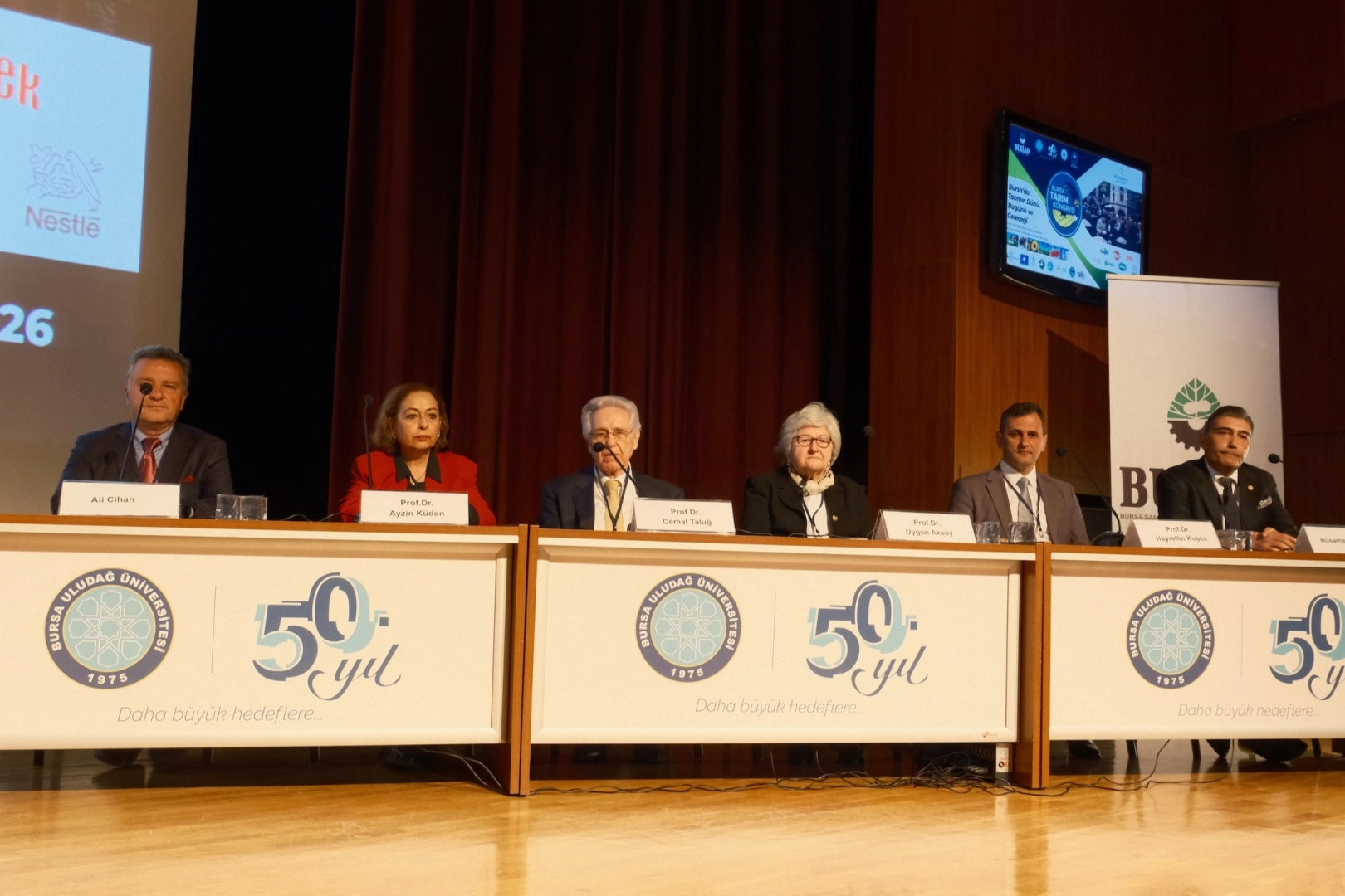 Açılış konuşmalarının ardından "Tarımsal Üretim" başlıklı panele geçildi. Oturum başkanlığını Ekolojik Tarım Organizasyonu Derneği Başkanı Prof. Dr. Uygun Aksoy'un yaptığı panelde; Hamidiye Tarım Mesleki ve Teknik Anadolu Lisesi Müdürü Ali Cihan "Bursa Tarım Eğitiminde 135. Yıl", Ziraat Fakülteleri Eğitim Programları Değerlendirme ve Akreditasyon Derneği (ZİDEK) Başkan Yardımcısı Prof .Dr. Ayzin Küden "Tarım Eğitiminde Akreditasyon", Tarım ve Gıda Etiği Derneği Başkanı Prof. Dr. Cemal Taluğ "Tarımsal Üretim ve Etik", BUÜ Ziraat Fakültesi Biyosistem Mühendisliği Bölümü Öğretim Üyesi Prof. Dr. Hayrettin Kuşcu "Tarımsal Kuraklık ve Sulama Yönetimi", BUSİAD Yönetim Kurulu Başkan Yardımcısı Hüsamettin Çoban ise "AB Yeşil Anlaşması ve Tarım Sektörü" konulu konuşma yaptı.