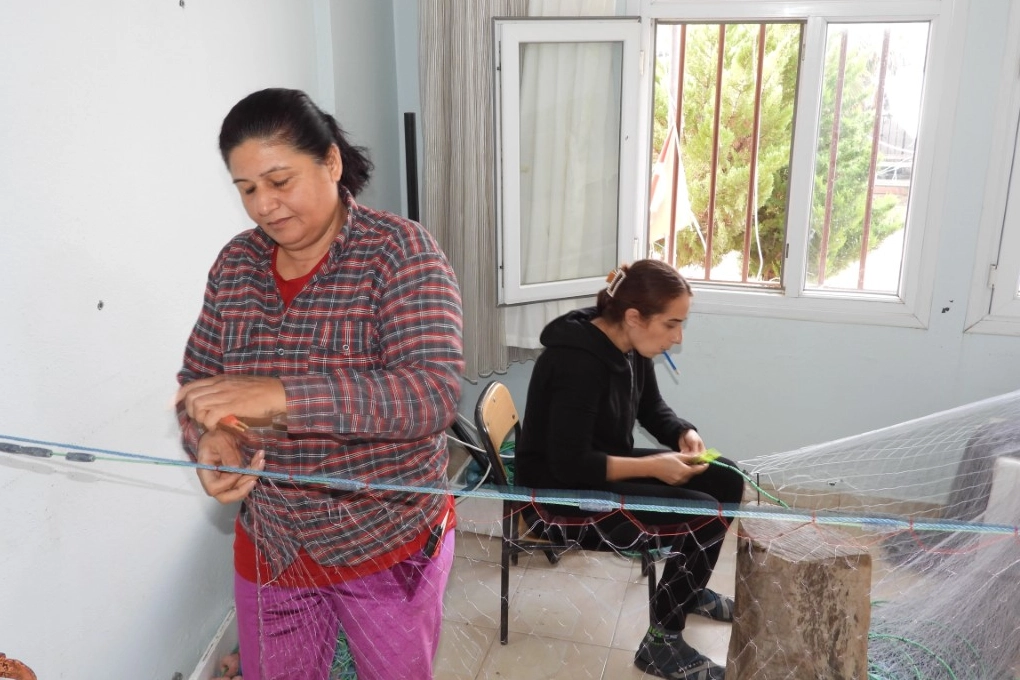 Depremlerde evlerini kaybeden Seher Aşker ve Çiğdem Okur, Tekebaşı Mahallesinde balıkçı ağları örerek hem depremi unutmaya çalışıyorlar hem de aile ekonomisine katkı sağlıyor.