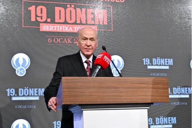 MHP Genel Başkanı Devlet Bahçeli, parti genel merkezinde düzenlenen "Liderlik ve Siyaset Okulu 19. Dönem Sertifika Töreni"nde konuştu. Bahçeli, konuşmasında Türkiye'nin iç ve dış siyasetine dair önemli değerlendirmelerde bulundu.