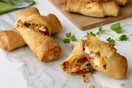 *Yufkanın bir tanesini temiz bir tezgâha yayın, üzerine 3 yemek kaşığı kadar çırpılmış sostan sürün. İkinci yufkayı ilk yufkanın üzerine yerleştirin, sosun 2 - 3 yemek kaşığı kadarını üzerine sürün. Sekiz eşit üçgen parça olacak gibi bıçak yardımıyla kesin. Üçgenlerin geniş tarafına pastırmalı iç harcı eşit olarak pay edin. Fotoğraftaki gibi önce yanlarından kapatıp sonra gevşek rulolar halinde sarın. Tepsiye aralıklı olarak yerleştirin. Kalan sosu üzerlerine fırça yardımıyla sürün.