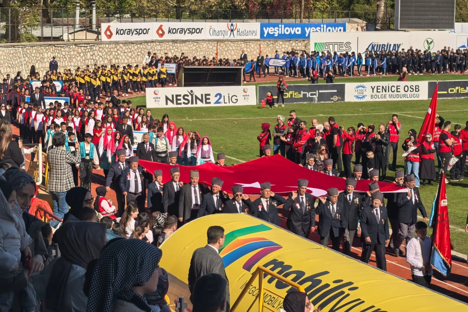 Saygı duruşu ve İstiklal marşının ardından Tören geçişi yapıldı. İnegöl Kaymakamı Eren Arslan, "29 Ekim 1923 şüphesiz binlerce yıldır şanlı tarihimizin en kudretli günlerinden biridir. Bugün büyük gururun 102. yıldönümünü gururla ve coşkuyla kutluyoruz. Öncelikle tarihimiz boyunca bu toprakları vatan kılma arzusuyla toprağa düşen tüm şehitlerimizi, şanlı ecdadımızı her bir karış toprağı şehit kanıyla sulanan bu toprakların aziz milletimizin ebedi yurdu olduğunu en güçlü delili olan Türkiye Cumhuriyeti’mizin kuruluşunda kan ve ter döken tüm kahramanlarımızı rahmet, minnet ve şükranla anıyoruz.