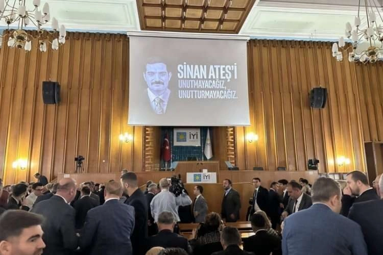 İYİ Parti Grup Toplantısı öncesinde projeksiyonda, "Sinan Ateş'i unutmayacağız, unutturmayacağız" şeklinde yansıtılan yazıda Sinan Ateş'i tekrardan gündeme getirdi.