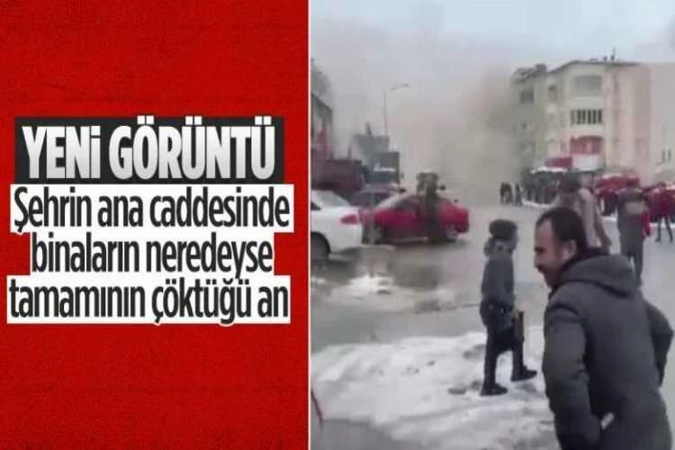 Görüntülerde depremle birlikte önce 2 katlı bir binanın yıkılması, daha sonra diğer yıkılan yapıların toz dumanı ile kaplaması yer aldı.