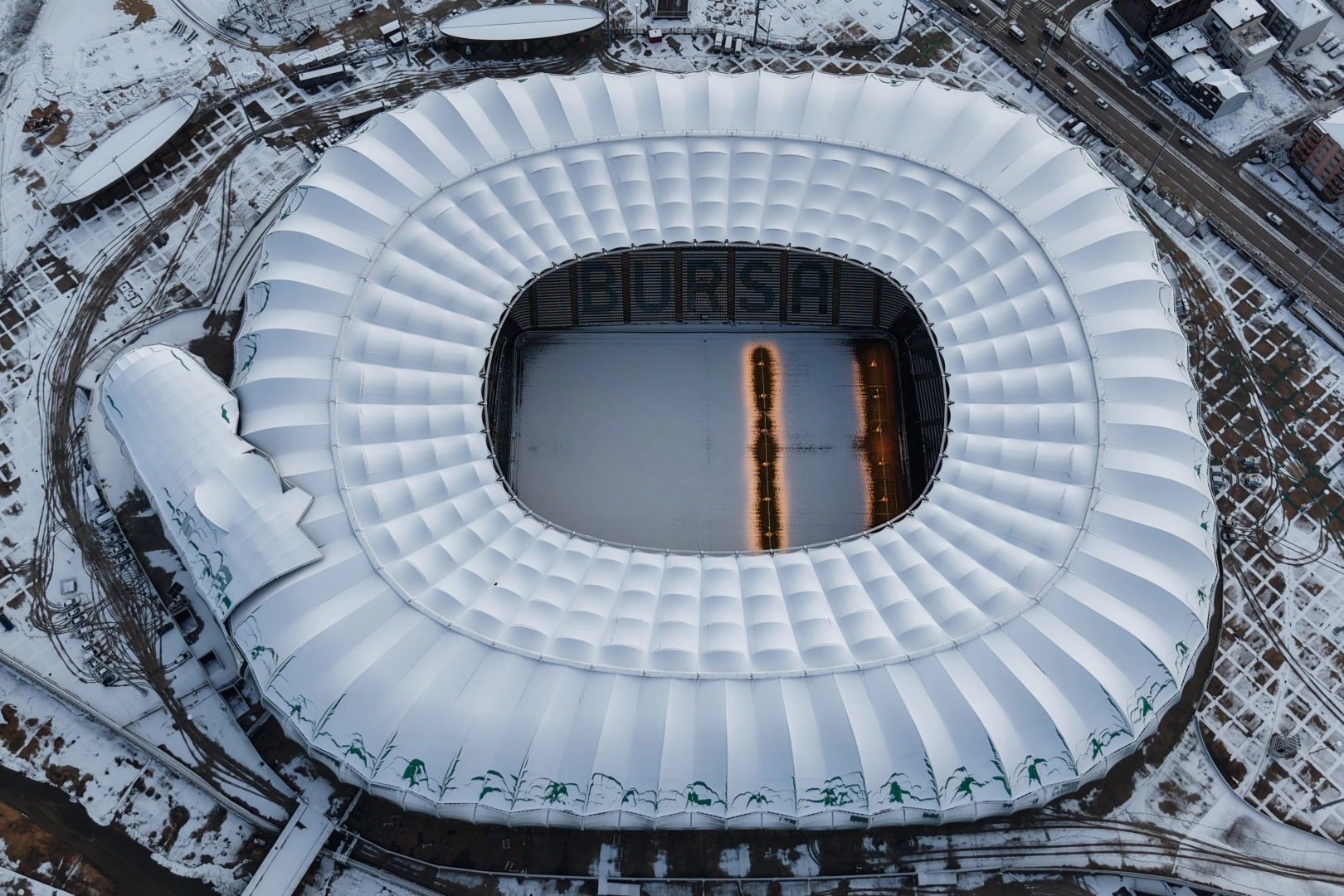 Bursa’da dün gece etkili olan kar yağışıyla birlikte Bursa'nın bir çok noktası beyaza büründü. Bursa'nın simgesi haline gelen Timsah Arena ismiyle bilinen Atatürk Spor Kompleksi Matlı Stadyumu, yeşille beyazın buluşmasıyla kartpostallık görüntüler ortaya çıkardı. Sahanın içerisine yağan kar, çimlerin bakımı için açılan güneş panelleriyle bir kısmının erimesi dikkat çekti.
