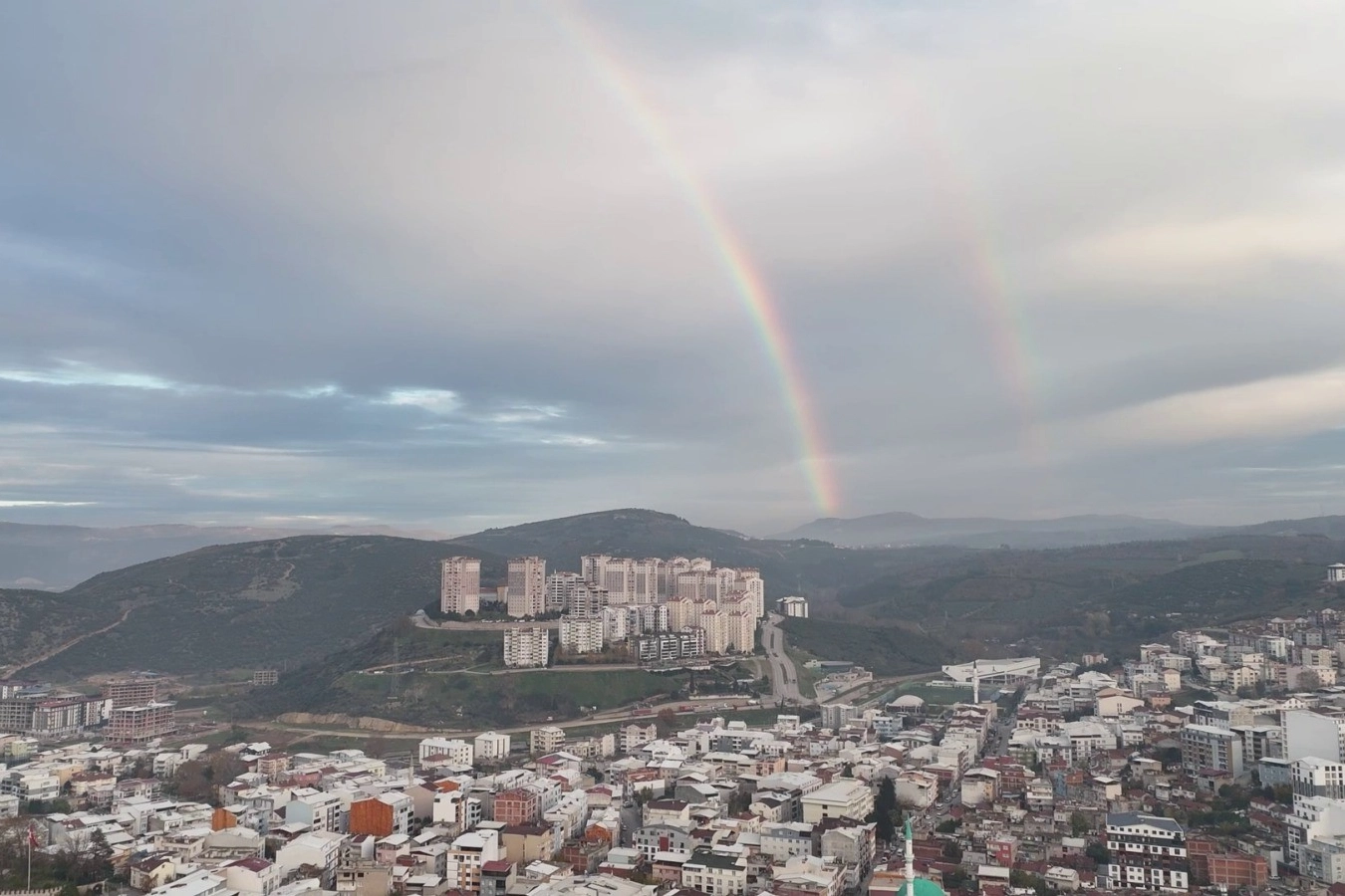 Bursa’nın Kestel ilçesi semalarında herhangi bir yağış olmamasına rağmen gökkuşağı oluştu. Gökkuşağının ortaya çıkmasıyla birlikte birçok vatandaş cep telefonlarıyla bu anları kaydetti. Görsel şölen sunan gökkuşağı dronla da görüntülendi.