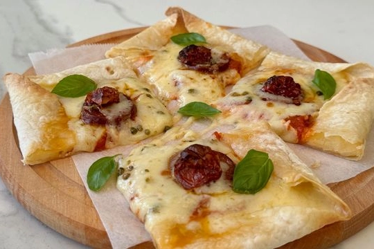 200 gr taze kaşar4 yemek kaşığı ev yapımı domates sosu8 dilim sucuk2 adet lavaş, 25 cm lik1 çay kaşığı kuru kekik
