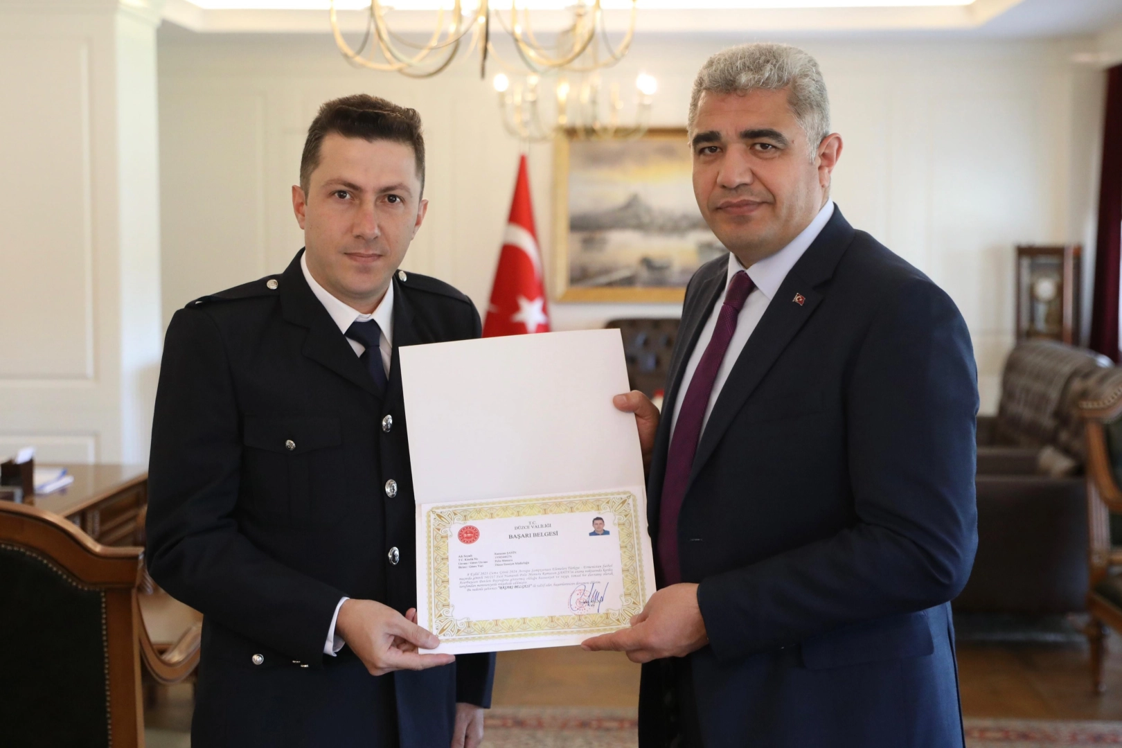 Türkiye ile Ermenistan arasında oynanan şampiyonada Azerbaycan bayrağına göstermiş olduğu hassasiyet ve saygı nedeniyle Polis Memuru Ramazan Şahin, Düzce Valisi Selçuk Aslan tarafından başarı belgesi ile ödüllendirdi. Düzce İl Emniyet Müdürlüğüne görevli polisler Türkiye- Ermenistan arasında oynanan UEFA 2024 Avrupa Şampiyonası eleme maçı giriş kontrolü için görevlendirilmişlerdi. Giriş noktasında bir vatandaşın üzerinde Azerbaycan bayrağı vardı. Vatandaştan Azerbaycan Bayrağına alıp göstermiş olduğu hassasiyet ve saygı nedeniyle görevli Polis Memuru Ramazan Şahin Düzce Valisi Selçuk Aslan tarafından başarı belgesi ile ödüllendirdi.
