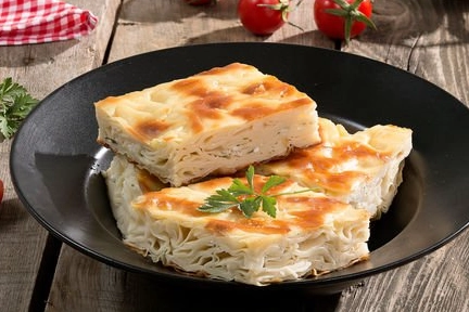 Yumurta, su, süt ve yağı derin bir kasede çırpın. Tepsinizi yağlayın. İlk yufkayı kuru olarak serin. Diğerlerini kasede hazırladığınız karışıma batırarak döşeyin. Islatarak koyduğunuz her kata 2 çorba kaşığı unu elekten geçirerek serpiştirin. Orta kata peyniri döşeyin. Kalan yufkaları yine kaseye batırın ve unu eleyerek döşeyin. En son yufkayı da yerleştirdikten sonra kalan karışımı üzerine sürün. 200 derecede ısıttığınız fırında pişirin. Fırından çıkınca üzerine başka bir tepsi kapatın. Böreği ters çevirin. Bu şekilde 30 dakika dinlendirdikten sonra kesip servis edin. Dilerseniz peynire kıyılmış maydanoz da ekleyebilirsiniz.