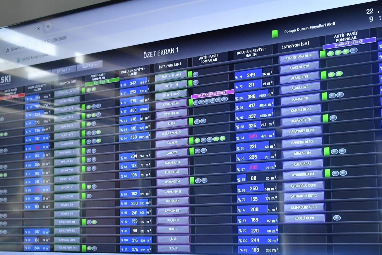 Samsun Büyükşehir Belediyesi Su ve Kanalizasyon İdaresi (SASKİ) Genel Müdürlüğü, ‘Yönetsel Denetim ve Veri Elde Etme Sistemi’ (SCADA) ile kentin 17 ilçesindeki farklı noktalarında bulunan tesisleri tek merkezden kontrol ediyor. SASKİ bünyesinde yer alan SCADA Ana Kontrol Merkezi, gelişmiş bilgisayarlarla donatılmış, özel bilgisayar yazılımları ile destekleniyor. Vardiya sistemine göre 24 saat kesintisiz hizmet verilen merkezde, 2 operatör sürekli bilgisayar başında bulunarak, dış istasyonlardan gelen verileri alıp değerlendiriyor. Sistem ile su kaçakları ve şebeke arızaları anında tespit ediliyor. Samsun Büyükşehir Belediye Başkanı Mustafa Demir, içme suyunu temin ederken kesintisiz, kaliteli ve güvenli hizmet vermek için şebekenin ve tüm tesislerin tek merkezden kontrol altında tutulmasının önemli olduğunu belirterek, ‘SCADA sistemi’ ile işletmelerde meydana gelebilecek herhangi bir arızaya anında müdahale edildiğini ve sorunların kısa sürede çözüme kavuşturulup olası maddi kayıpların da önüne geçildiğini söyledi. ‘SCADA sistemi’ ile SASKİ’nin performansında önemli artış yaşandığını da ifade eden Başkan Demir, "Terfi merkezlerini, su depolarını, barajlardaki su seviyelerini, tesislerdeki anlık gelişme ve değişimleri, sahadaki motor ve pompalar olmak üzere şu anda 289 noktayı bir bilgisayardan 7/24 saniye saniye takip ediyoruz. Arıza anında ekiplerimiz online bağlantı ile de uzaktan müdahale edebiliyor. Bu sayede şehirdeki tüm tesislerimizi kontrol altında tutuyor, herhangi bir sorun yaşanması halinde anında müdahale ederek, yaşanan arızayı gideriyoruz. Böylece Samsun'da içme suyu dağıtımının sürekliliğini sağlamış oluyoruz" ifadelerini kullandı. ‘SCADA sistemi’ ile ilgili bilgi veren SASKİ Bilgi İşlem Dairesi Başkanı Osman Can Mercimekci, 695 bin 548 abonesi bulunan SASKİ’nin, Samsunlulara en iyi hizmeti vermek için gelişen teknolojinin tüm olanaklarını kullandığını söyledi. Mercimekci, "Samsun genelindeki 110 su deposu, 83 depo terfi, 13 pompa istasyonu, 7 içme suyu arıtma tesisi, 56 sondaj ve keson, 20 ham su ve atık su tesisi olmak üzere toplamda 289 tesis SCADA sistemine bağlıdır. Genel Müdürlük bünyemizde yer alan SCADA Sistemi, gelişmiş sunucularla donatılmış, özel bilgisayar yazılımları ile desteklenmiştir. Vardiya sistemine göre 24 saat kesintisiz hizmet verilen SCADA Kontrol Merkezi’nde, 2 operatör sürekli bilgisayar başında bulunarak, dış istasyonlardan gelen verileri alıp değerlendirmektedir” dedi. SCADA Sistemi ile izlenen 289 tesisin ölçüm yapan elektronik cihazlarla donatıldığının da altını çizen Mercimekci, bu cihazların yaptıkları ölçümler yedekli haberleşme sistemleri üzerinden SASKİ Kontrol Merkezi’ne ulaştırıldığını bildirerek şunları söyledi: "Depo seviyeleri ve pompa çalışma süreleri otomatik senaryoda insan müdahalesine gerek kalmaksızın kontrol edilerek abonelere içme suyunun kesintisiz ulaşması sağlandığı gibi gerekli hallerde SCADA Sisteminin hem sahadaki mobil cihazlar üzerinden hem de merkezdeki bilgisayarlardan, vanalara ve pompalara komut (kapama, açma ve çalıştırma, durdurma gibi) gönderme kabiliyetine sahip. Dış istasyonlarda yapılan ölçümlerin tamamı Kontrol Merkezi’nde anlık olarak izlenmektedir. Anlık olarak görülen bu değerler ise bilgisayarlara tarihsel olarak kaydedildiği için istenildiği zaman geriye dönük bu değerlere ulaşmak mümkün olmaktadır."