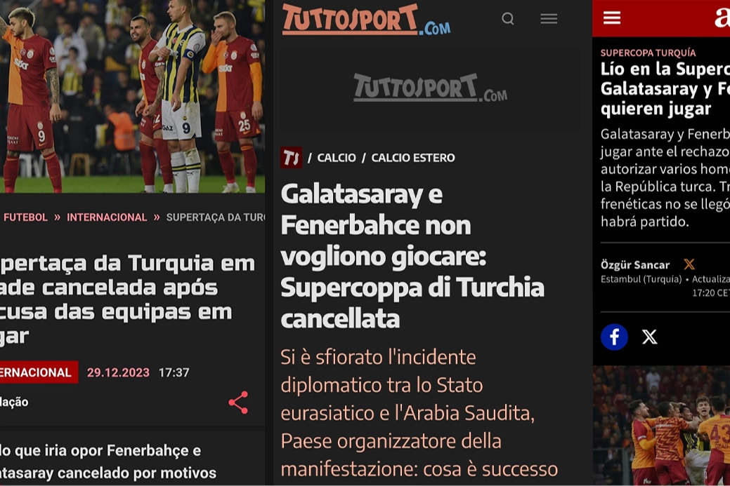 İtalyan Tuttosport’da da gerçekleşen maça çıkmama kararıyla ilgili yapılan haberde, “Riyad’da yapılması planlanan Türkiye Süper Kupası için geçerli olan ve yılbaşı arifesinde şampiyonun belli olacağı, Mauro Icardi’nin Galatasaray’ı ile Edin Dzeko’nun Fenerbahçe’si arasında oynanacak derbi maçı oynanmayacak. Her iki kulüp de İstanbul’a dönmüş olup, kupanın daha sonra ileri bir tarihte oynanacak şekilde iptal edilmesine karar verildi” şeklinde paylaşıldı.