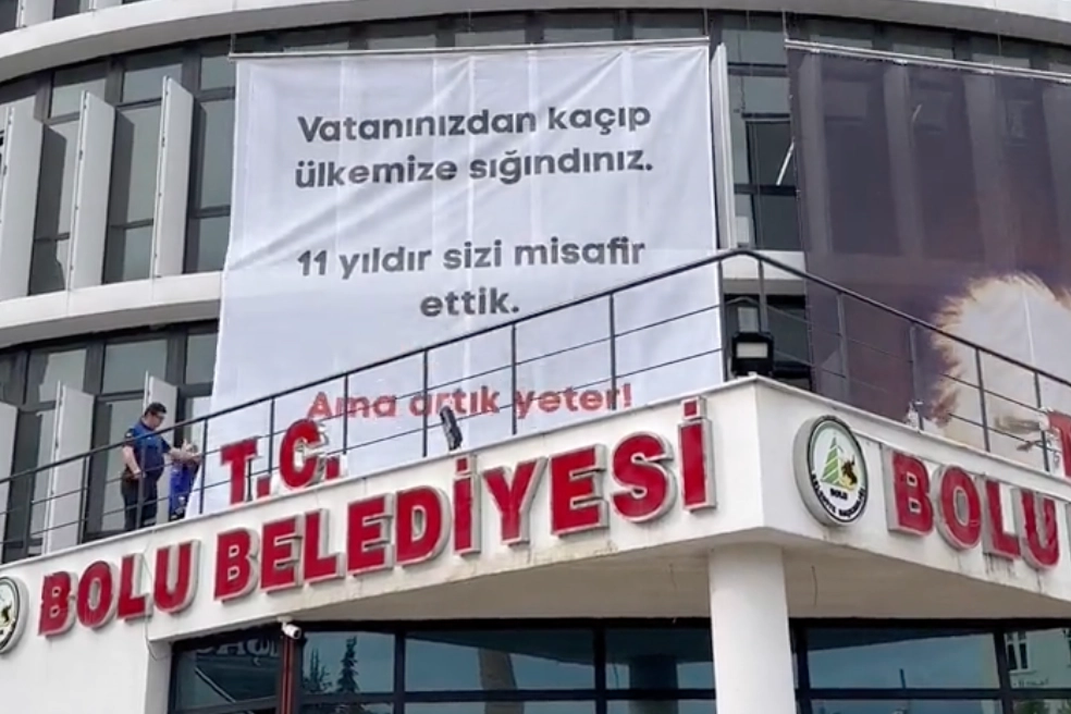 Bolu Belediye Başkanı Tanju Özcan'ın, belediye binasına 'mültecilerin gitmesiyle ilgili' astığı afiş şikayetler sonucu kaldırıldı.