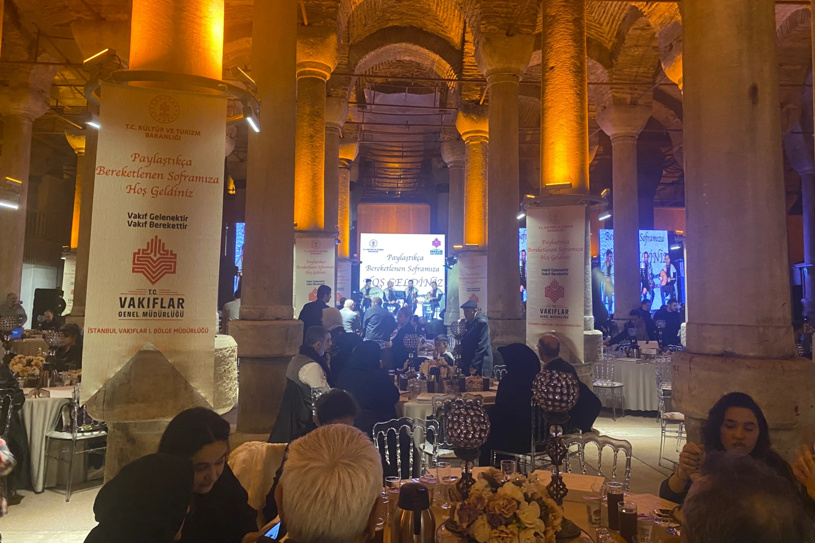 Vakıflar İstanbul 1. Bölge Müdürü Yavuz Güner, “Binbirdirek Sarnıcı'nda günlük 700 kişiyi ağırlıyoruz. Tüm yapılan bu hizmette devletimizin hazinesinin kasasından 1 lira para harcanmadan tamamen hayırsever vatandaşlarımızla gerçekleştirmekteyiz" dedi. Kültür ve Turizm Bakanlığı Vakıflar Genel Müdürlüğü Vakıflar İstanbul 1. Bölge Müdürlüğü tarihi Binbirdirek Sarnıcı’nda iftar sofraları kurmaya devam ediyor. Muhtaç kimselerin ağırlandığı iftar programında Ramazan-ı Şerif boyunca 40 bin vatandaşa sıcak yemek ikramında bulunulacak. Tarihi mekanda verilen iftarda, günlük 700 vatandaş ağırlanırken, program Kuran-ı Kerim tilavetiyle başladı. İlahi dinletisiyle devam eden programda, iftar bitiminde bereket duası yapıldı. Ayrıca iftardan sonra Osmanlı macunu ve mısır ikram edildi. Öte yandan Vakıflar İstanbul 1. Bölge Müdürlüğü'ne ait mobil aşevi araçlarıyla Eyüpsultan Meydanı’nda her hafta cuma, cumartesi ve pazar günleri, Tekirdağ’da ise Orta Camii Meydanı’nda her hafta salı ve çarşamba günleri sıcak yemek ikram ediliyor. "Ramazan ayı boyunca 40 bin vatandaşımıza sıcak yemek ikramında bulunacağız" Düzenlenen iftar programı hakkında bilgi veren İstanbul Vakıflar 1. Bölge Müdürü Yavuz Güner, "Kültür ve Turizm Bakanlığı Vakıflar Genel Müdürlüğü olarak bu yıl 81 ilde 'vakıf iftar sofraları' gerçekleştiriyoruz. Paylaştıkça bereketlenen vakıf sofralarında öksüzlerimizi, yetimlerimizi, devlet yurtlarında kalan kimsesiz çocuklarımızı, yüksek ve ortaöğretimde okuyan çocuklarımızı, kimsesiz, ihtiyaç sahibi vatandaşlarımızı bu tarihi mekanda ağırlamaktayız. Burada aynı zamanda gelen vatandaşlarımızın çocuklarını Osmanlı geleneklerini öğrenmesini istediğimiz için Nasreddin Hoca, Keloğlan, Hacivat Karagöz gösterileri yapılıyor. Bunun yanı sıra Osmanlı macunu, şerbeti, pamuk şeker ve patlamış mısır hizmeti vermekteyiz. İftar sofralarımızda Eyüpsultan'da bulunan aşevimizde kesilen, hayırseverlerimiz tarafından bağışlanan kurban etlerimizi dağıtmaktayız. İftardan önce Kuran-ı Kerim tilaveti ve yemek duası yapmaktayız. Bunun yanı sıra Tekirdağ Orta Camii Meydanı'nda ve Eyüpsultan Meydanı'nda mobil aş araçlarımız ile her gün sıcak yemek ikramında bulunuyoruz. Ramazan ayı boyunca 40 bin vatandaşımıza sıcak yemek ikramında bulunacağız. Binbirdirek Sarnıcı'nda günlük 700 kişiyi ağırlıyoruz. Tüm yapılan bu hizmette devletimizin hazinesinin kasasından 1 lira para harcanmadan tamamen hayırsever vatandaşlarımızla gerçekleştirmekteyiz. Hayırsever vatandaşlarımıza buradan teşekkür ediyorum" ifadelerini kullandı.