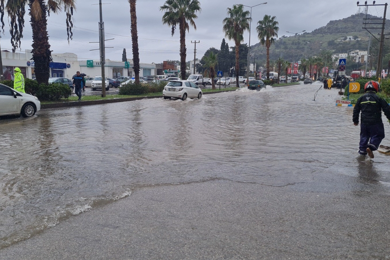 Muğla’nın Bodrum ilçesinde etkili olan sağanak yağış nedeniyle yollar dereye döndü, bazı yollar yağış nedeniyle trafiğe kapandı. Bodrum’da bugün sağanak yağış etkili oldu. Özellikle ilçenin merkezi bölgelerinde kuvvetli şekilde yağan yağmur, günlük yaşamı olumsuz şekilde etkiledi. Yağış anında göle dönen Kıbrıs Şehitleri Caddesi araç trafiğine kapandı. Bodrum Belediyesi ekipleri, çöplerle tıkanan mazgallarda yağış boyunca çalışma yaptı. Yoldaki suyun azalmasıyla cadde yeniden trafiğe açıldı. İlçe merkezindeki bazı sokak ve caddeler de yağış esnasında dereye döndü, araçlar caddelerde güçlükle ilerledi. Belediye ekiplerince sorun olan bölgelerde çalışmalar yürütülüyor. Öte yandan, vatandaşlar bu tür teknik problemlerin çözülmesini istedi. Her yağmurda aynı manzaralardan bıktıklarını açıkladı.