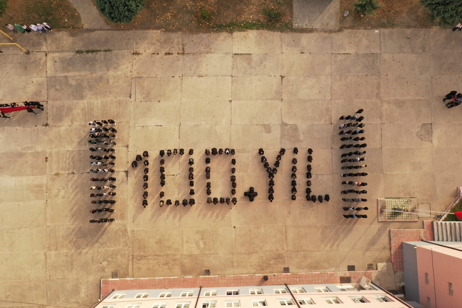 230’a yakın öğrenci ve öğretmenleri ile birlikte okul bahçesinde 100. Yıl koreografisi yaptı.