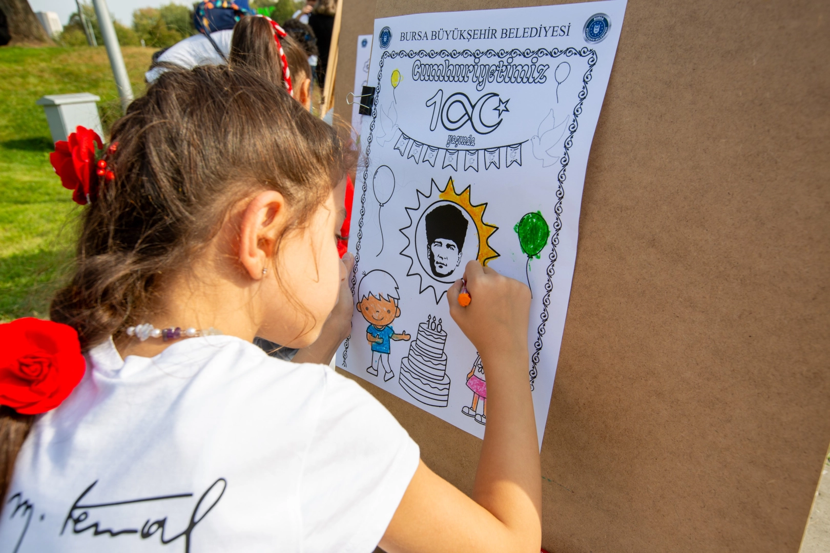 Bursa Büyükşehir Belediyesi’nin Cumhuriyet’in 100’üncü yılı etkinlikleri çerçevesinde düzenlendiği açık hava resim yapma etkinliğine katılan yüzlerce çocuk, tuval başında hünerlerini gösterdi.