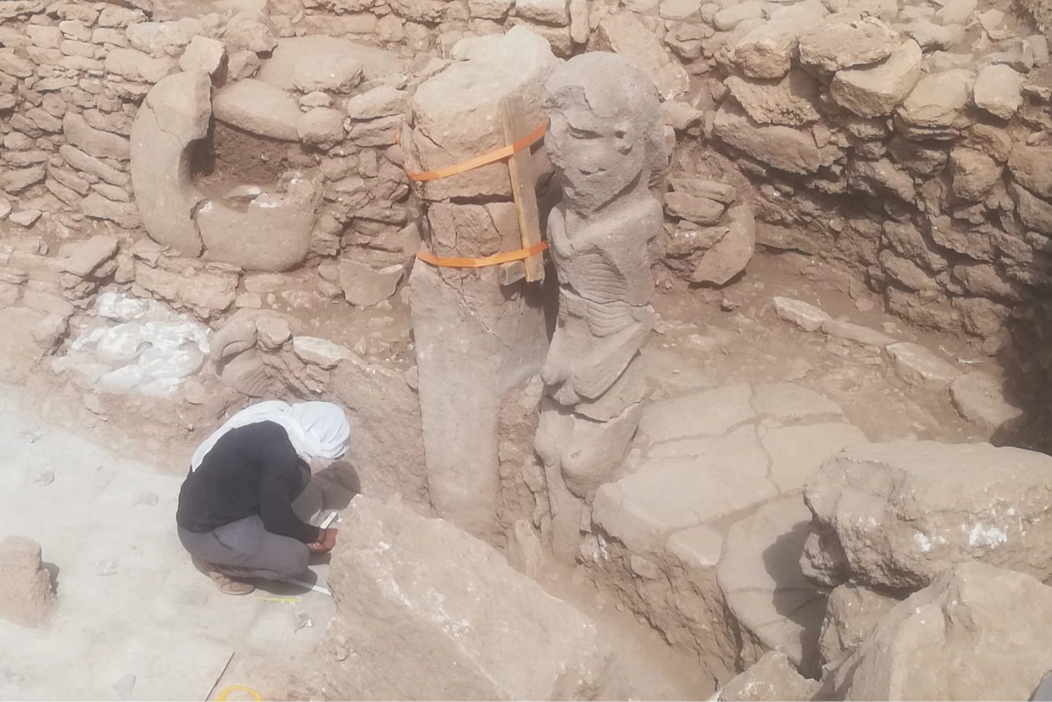 Taş Tepeler içerisinde yer alan ve Göbeklitepe ile aynı dönemlerde yapıldığı tahmin edilen Karahantepe’deki kaz çalışmalarında bir insan heykeli bulundu. Açığa çıkarılan kısımları 2 metre 30 santimetre uzunluğunda olan heykelin yan tarafında ise bir akbaba ve tabakların olduğu gözlendi. Heykelin oturur vaziyette olduğunu ve ayak kısımlarının halen toprak altından çıkartılmadığını belirten Karahantepe ve Göbeklitepe Kazı Başkanı Prof. Dr. Necmi Karul, yapıdaki nihai tablonun gelecek yıl yapılacak kazılarla ortaya çıkacağını belirtti. Heykele gömülmeden önce kısmen zarar verildiğini söyleyen Karul, “Sezon sonuna geldik. Burada daha önceki yapılara benzer bir özel yapı, kamusal yapı ortaya çıkarttık. Bu kamusal yapının içerisindeki heykeller, taş tabaklar vesaire, dağılımı bu binanın diğerleri gibi bilinçli olarak gömüldüğünü bize gösteriyor. Gömülmeden önce de kısmen tahrip edildiğini anlıyoruz. Dolaysıyla bu gömülme işlemi arkeologların o buluntuları özgün konumlarında bulma fırsatı veriyor. Bu eserlerden bir tanesi bir insan heykeli. Yaklaşık 2 metre 30 santimetre boyutunda ama tam ayak kısmını açmış değiliz. Dolayısıyla biraz daha uzun olabilir. Heykel oturur pozisyonda ve oran olarak bir insan boyutundan biraz daha büyük. Ön yüzde kaburgaları gözüküyor. Yan cephesinde de ellerinin kabartmayla biçimlendirildiğini görüyoruz. Elleri ön tarafa, belinin altından fallusunu tutar şekilde betimlenmiş. Bunun hemen yanında bir akbaba heykeli duvarın içerisine yerleştirilmiş. Yanında da taş tabaklar konumlandırılmış. Dolayısıyla bu buluntu grubu yapının bu kesiminin geri kalandan farklı bir anlam ifade ettiğini gösteriyor ama kazıları henüz yeni bitiriyoruz bu alanda. Heykelin bilinçli olarak kırıldığını görüyoruz ki bu diğer, daha önceki buluntularımızda da söz konusu. Kırma işlemi heykel ayaktayken gerçekleştirildiğinden dolayı bu parçalar alanın farklı yerlerine dağılmış olabiliyor. Kazı sırasında biz alan içerisinden çıkan bütün taşları bir yerde biriktiriyoruz ve şimdi yavaş yavaş bu parçaları buldukça heykelin tümlenmesini gerçekleştireceğiz ama sonuçta burada yaklaşık 20 metre çapında bir binanın olduğunu, bu binanın içerisinin insan ve hayvan heykelleriyle donatılı olduğunu gördük. Yine bu binanın etrafında da dörtken planlı çok sayıda odanın yerleştirildiğini açığa çıkarttık. Nihai tabloyu gelecek yıl yapacağımız çalışmalarda daha net göreceğiz” diye konuştu. Öte yandan bu sezon sona yaklaşılan kazı çalışmalarındaki hassasiyet de dikkatlerden kaçmadı. Uzman ekip gözetiminde sürdürülen çalışmalar iğne ile kuyu kazar gibi sürdürülüyor.