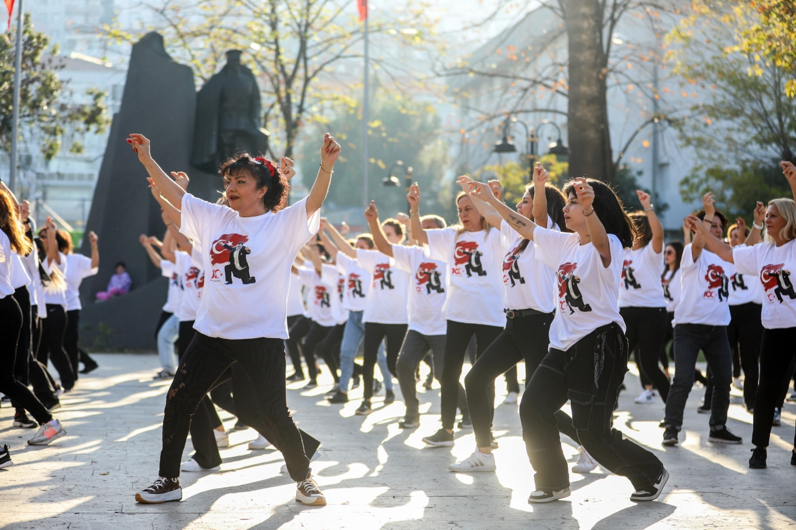 Mudanya Belediyesi Halk Dansları Topluluğu Eğitmeni Kenan Çelik yönetiminde yapılan gösteride, İskele Meydanı’nda bulunan Atatürk heykeli önünde 100 kişi zeybek oynadı. Gösteri; ay yıldız figürü yapımı ve 10. Yıl Marşı ile sona erdi.