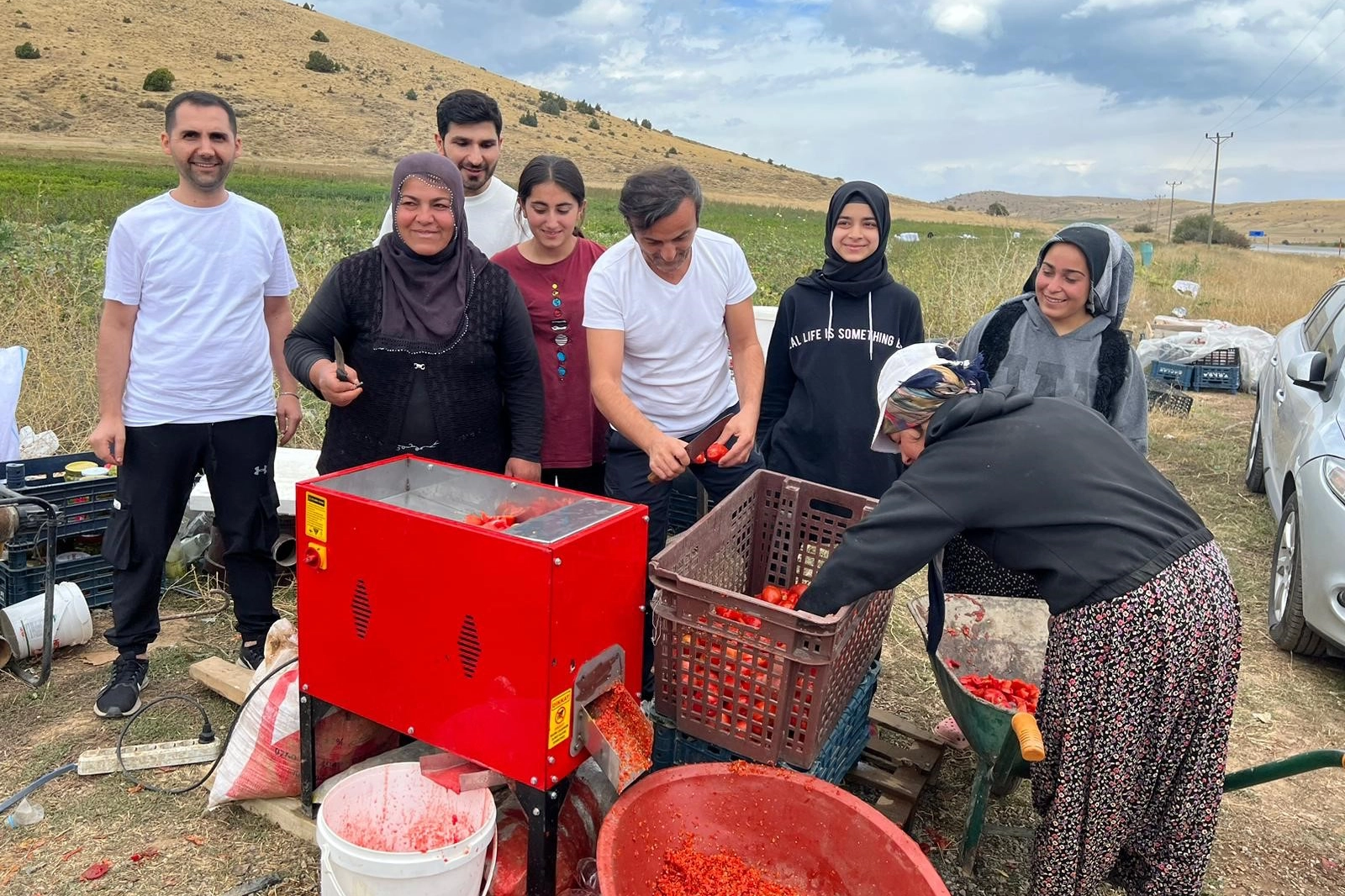 ‘Kalp Estetiği’ filminin galasına giden oyuncu Ersin Korkut, Müge Boz ve Evliya Aykan, Tatvan ilçesine bağlı Yelkenli köyünde yol kenarında tarlada çalışan işçileri görünce araçtan indiler. Tarım işçileriyle birlikte tarlada domates toplayan oyuncular, domates salçası yaptı. Tarlada çalışan oyuncularla hatıra fotoğrafı da çekilen oyuncular, daha sonra Van’a gitmek üzere yollarına devam etti.