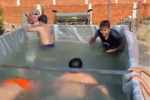 Bursa'nın Yenişehir ilçesinde sahibi olduğu kamyonun kasasını naylon ile kaplayıp içerisine su dolduran bir vatandaş kamyonu çocuklar için yüzme havuzu haline getirdi.