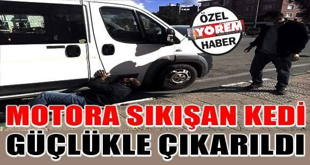 Heykel önünde işçilerin gelmesini bekleyen servis aracının motor bölümünden kedi sesi gelmesiyle başlayan kurtarma çalışması başarıyla sonuçlandı.