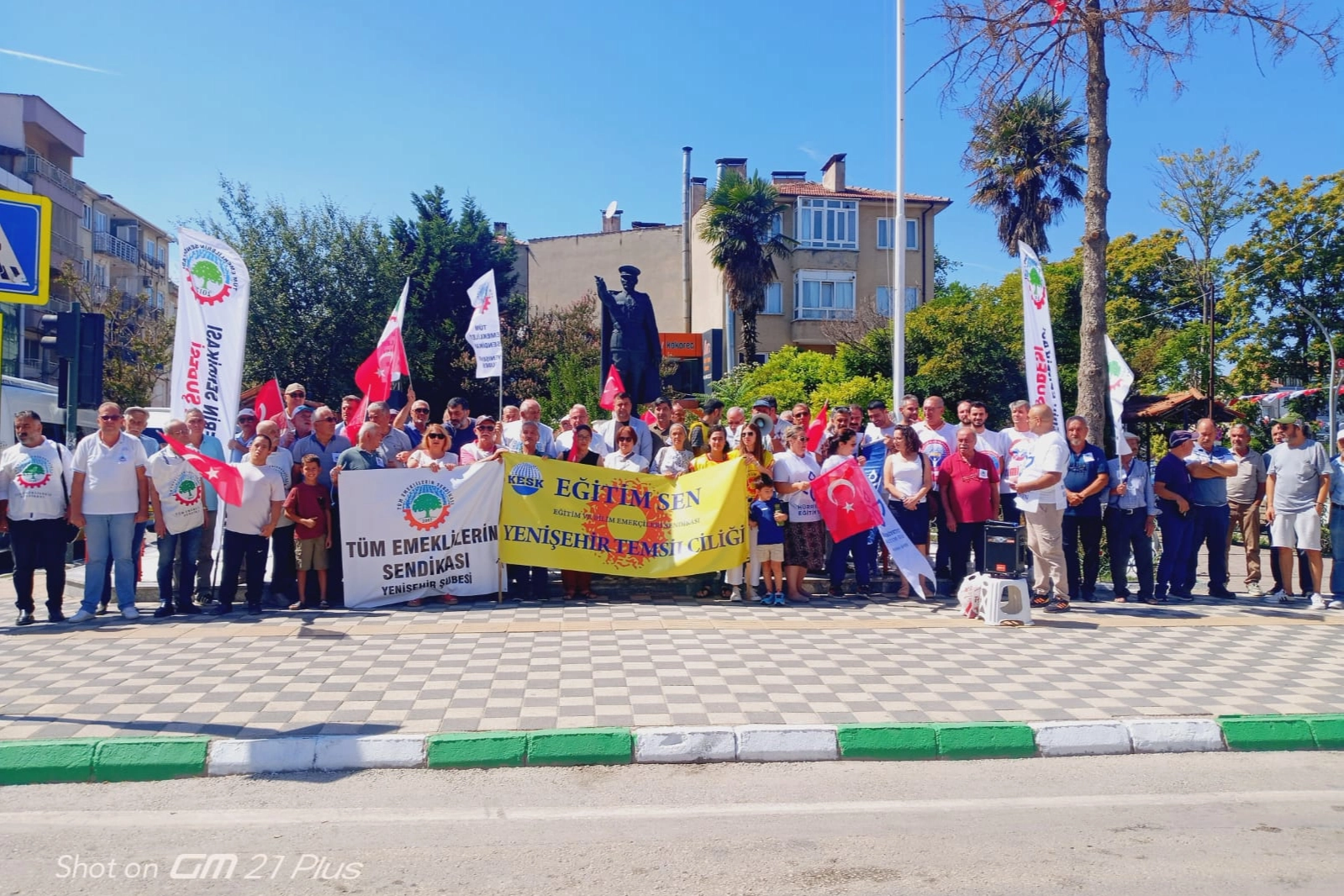 Yenişehir Emek ve Demokrasi Platformu’nu oluşturan 4 sendika bir araya gelerek bir basın açıklaması düzenledi. Atatürk Anıtı önündeki basın açıklamasına Tüm Emeklilerin Sendikası Yenişehir Şubesi, Eğitim-Sen, Hürriyetçi Eğitim-Sen ve Eğitim-İş yönetici ve üyeleri katıldı. Sendikalar ayrı ayrı basın açıklaması okudu. Basın açıklamalarında, memurlara ve memur emeklilerine yapılan zamlar protesto edildi. Maaşların yoksulluk sınırının altında kaldığı vurgulandı. . Kamu emekçileriyle emeklilerin kaderinin ortak olduğu ifade edilen açıklamalarda işçiler, işsizler, emekçiler ve emeklilerin aynı politikaların mağduru olduğu dile getirildi.