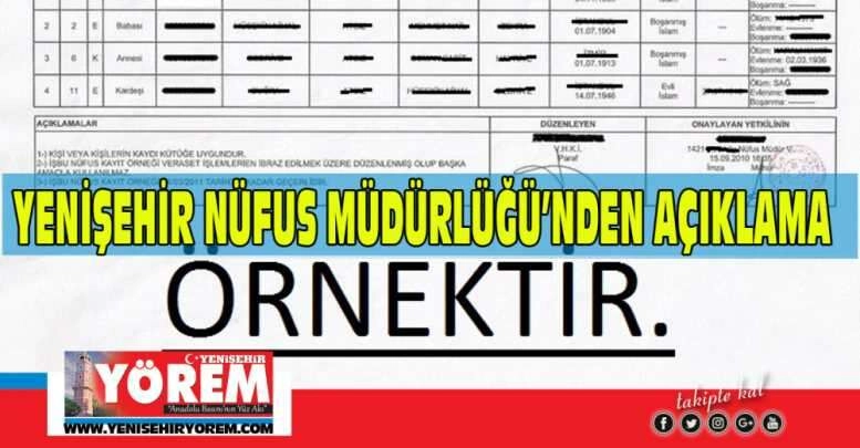 Nüfus Müdürlüklerindeki iş yoğunluklarının daha da azaltılması amacıyla Bakanlığımız 180 günlük eylem planına e-Devlet üzerinden Aile (kişi, eş ve çocuk) ve Nüfus Aile (kişi, eş, çocuk, anne ve baba) Kayıt Örnekleri ve Nüfus Olaylarının (Doğum, Evlenme, Boşanma, Ölüm, Kayıt Düzeltme, Velayet, Yer Değiştirme, Gaiplik, Vesayet, Tanıma, Soy bağı) paylaşımının yapılması dâhil edilmiştir. Yapılan çalışmalar 01.08.2017 tarihi itibari ile tamamlanmış ve ilgili Nüfus Kayıt Örnekleri ve Nüfus Olaylarının e -Devlet üzerinden paylaşımı yapılmaya başlanmıştır. E-Devlet üzerinden aşağıdaki belgeler alınabilmektedir. Kişi Kayıt Örneği: Sadece kişinin kendisine ait bilgileri içeren kayıtlardan oluşmaktadır. Aile Kayıt Örneği: Kendisi, Eşi, Çocukları ve varsa Eski Eş / Eşlerine (isteğe bağlı) ait bilgileri içeren kayıtlardan oluşmaktadır. Nüfus Aile Kayıt Örneği: Kendisi, Eşi, Çocukları, Anne / Babası ve Eski Eş / Eşlerine (isteğe bağlı) ait bilgileri içeren kayıtlardan oluşmaktadır. Yerleşim Yeri Diğer Adres Belgesi: Sadece kişinin kendisine ait bilgileri içeren kayıtlardan oluşmaktadır. 5490 Sayılı Nüfus Hizmetleri Kanunun Uygulanmasına ilişkin yönetmeliğin 151. Maddesinin 4 fıkrasına gereğince E-Devlet kapısı üzerinden alınan belgeler, nüfus müdürlüklerinden alınmış resmi belgeler ile aynı hukuki değere sahip olup, tüm resmi işlemlerde kabul edilmesi yasal zorunluluktur.25.08.2017 Kamuoyuna saygı ile duyurulur.
