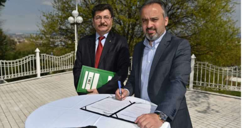Başkan Alinur Aktaş’a, ‘taahhütnameye imza atmasının ardından’ Türkiye Erozyonla Mücadele, Ağaçlandırma ve Doğal Varlıkları Koruma Vakfı (TEMA) Bursa İl Temsilcisi Şaban Uyar tarafından eko-siyaset belgesi takdim edildi.