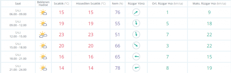 Meteoroloji Genel Müdürlüğü tarafından yapılan son değerlendirmelere göre: Ülkemizin kuzey, iç ve doğu kesimlerinin parçalı, yer yer çok bulutlu, Batı ve Orta Karadeniz kıyıları, Doğu Karadeniz, Doğu ve Güneydoğu Anadolu'nun doğusu ile Adana, Mersin, Osmaniye ve Hatay çevrelerinin yağışlı, diğer yerlerin az bulutlu ve açık geçeceği tahmin ediliyor. Yağışların, genellikle sağanak ve gök gürültülü sağanak, Doğu Karadeniz'in iç kesimlerinin yükseklerinde karla karışık yağmur ve kar şeklinde olmak üzere; Doğu Anadolu'nun güneydoğusu, Ağrı, Iğdır, Muş ve Siirt çevreleri ile Batman'ın doğu kesimlerinde yer yer kuvvetli olması bekleniyor. Sabah ve gece saatlerinde Marmara'nın güney ve doğusu ile iç kesimlerde yer yer pus ve sis bekleniyor.