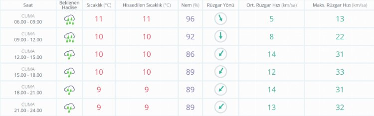 Çok bulutlu, aralıklı sağanak ve yer yer gök gürültülü sağanak yağışlı geçeceği tahmin ediliyor. Yağışların; Yerel kuvvetli olması bekleniyor.