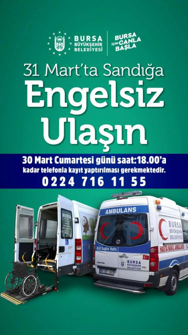 Bursa Büyükşehir Belediyesi olarak 31 Mart 2024 Yerel seçimlerinde bedensel engelli bireylerin ve yatağa bağımlı hastaların oy kullanması için liftli araçlarımız ve ambulanslarımız hizmet verecektir.