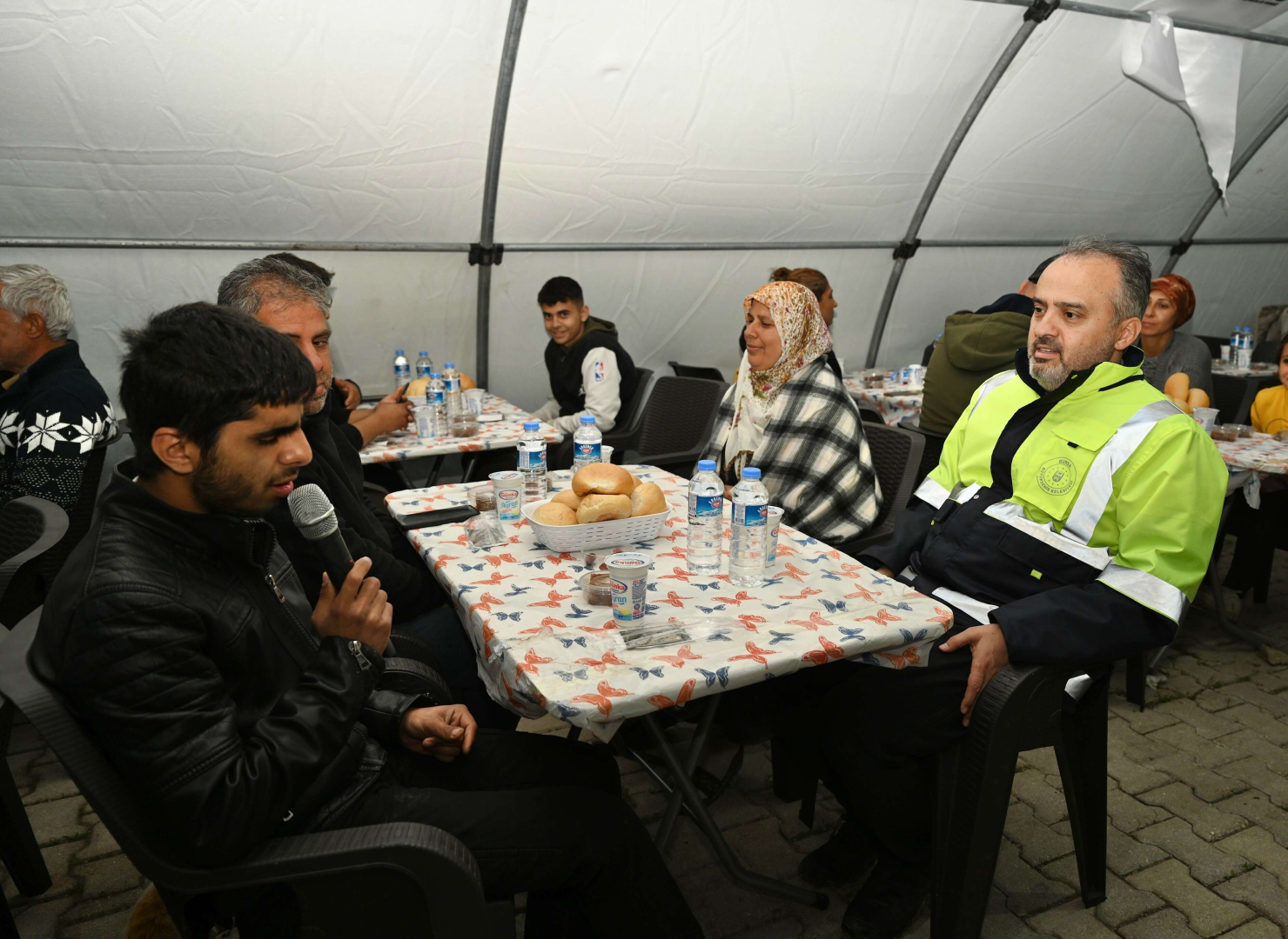 Devlet millet el ele Bursa Büyükşehir Belediye Başkanı Alinur Aktaş da yemeğe sponsor olan Balkantürksiad Başkanı Fatih Şakir ve Türkiye Sağlıklı Kentler Birliği Genel Sekreteri Ahmet Recep Tekcan ile birlikte orucunu iftar çadırında depremzedelerle birlikte açtı. Türkiye’nin iki ayrı depremle sarsıldığını ancak devlet millet el ele yaraların sarılmaya çalışıldığını belirten Büyükşehir Belediye Başkanı Alinur Aktaş, “Ramazan’ın bereketini depremzede vatandaşlarımızla birlikte yaşamaya çalışıyoruz. Bursa merkezde devam eden iftar programlarımızın yanında Hatay’da da 3 ayrı noktada her gün 2 bin kişiye iftar ve sahur yemeği veriyoruz. Ben özellikle Balkantürksiad ailesine, Türkiye Sağlıklı Kentler Birliği’ne, Samsun Makine’ye, Ergünler İnşaat’a ve sayamadığım tüm sponsorlarımıza yürükten teşekkür ediyorum. Her birinden Allah razı olsun. İnşallah devlet millet elbirliğiyle yaraları sarmaya devam edeceğiz. Ve nasip olursa o eski güzel günlere hep birlikte erişeceğiz” dedi.